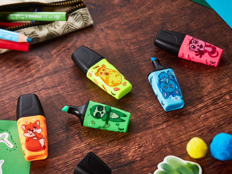 - STABILO BOSS MINI: mini evidenziatori in 5 tonalità fluorescenti, ognuna abbinata a un animale diverso – bradipo, pipistrello, lemure, volpe o criceto.